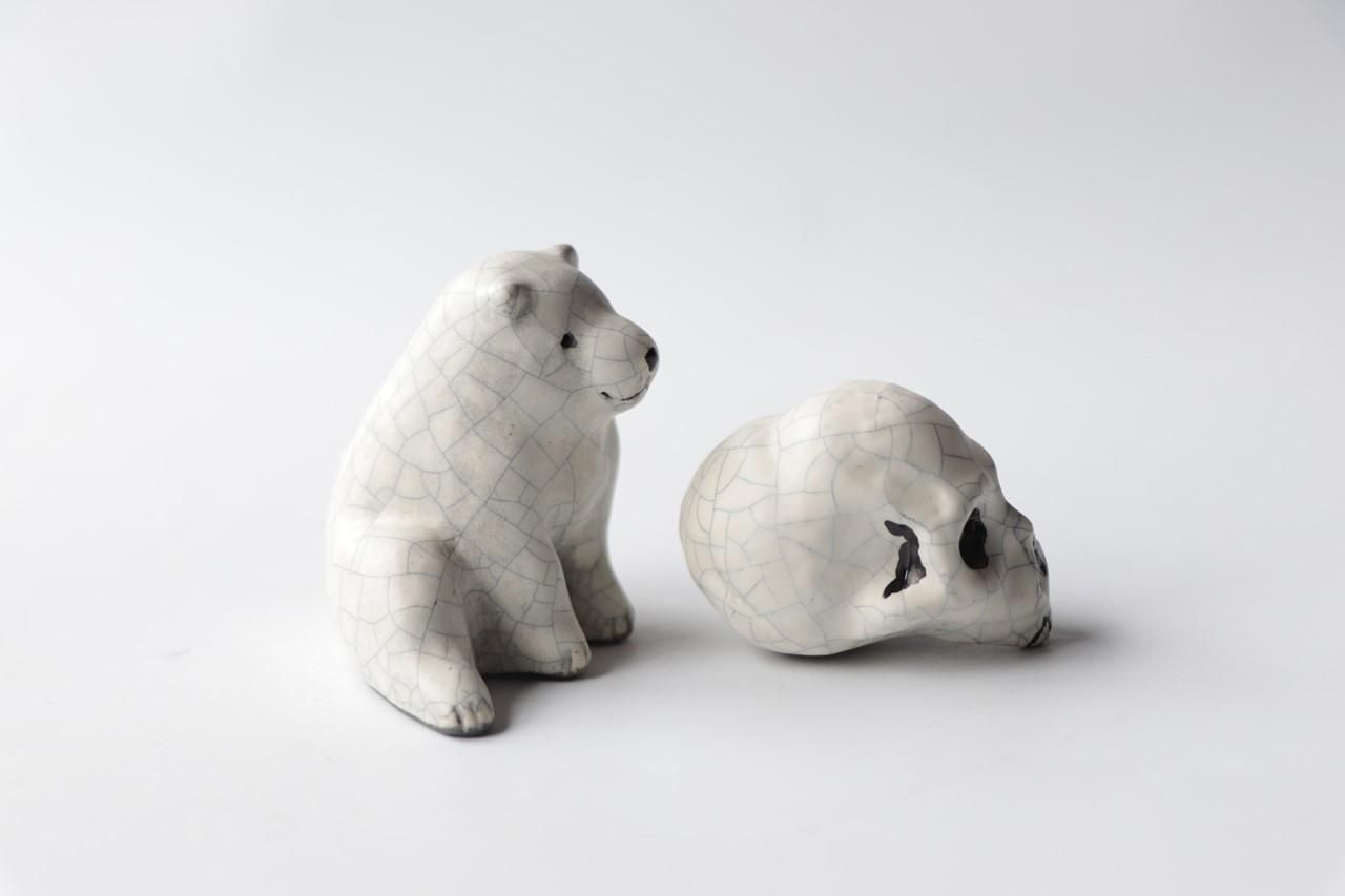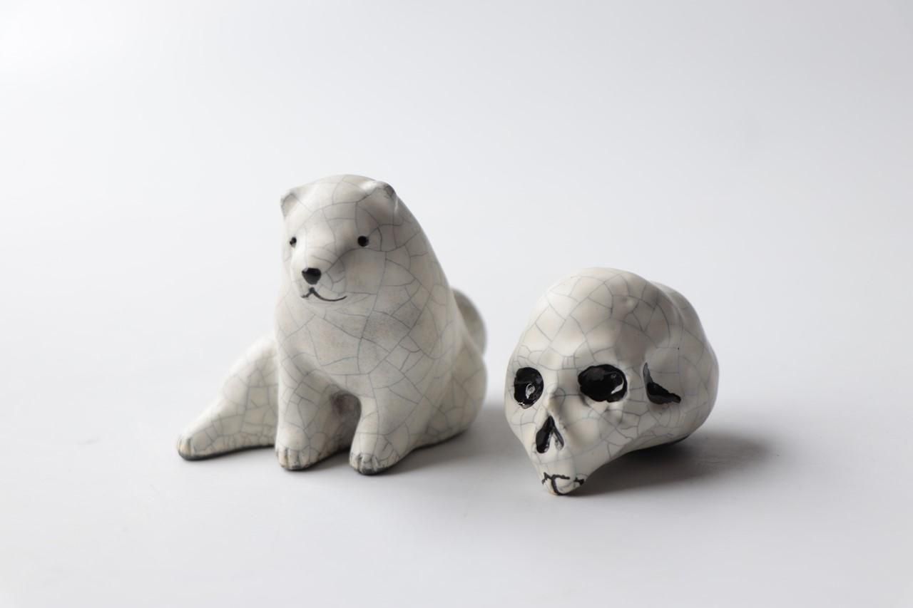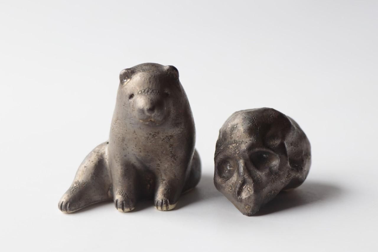 その活動で鍛えあげた造形力の中から生み出された、かわいくて思わず手に取りたくなる、芦雪の仔犬と髑髏のオブジェです。