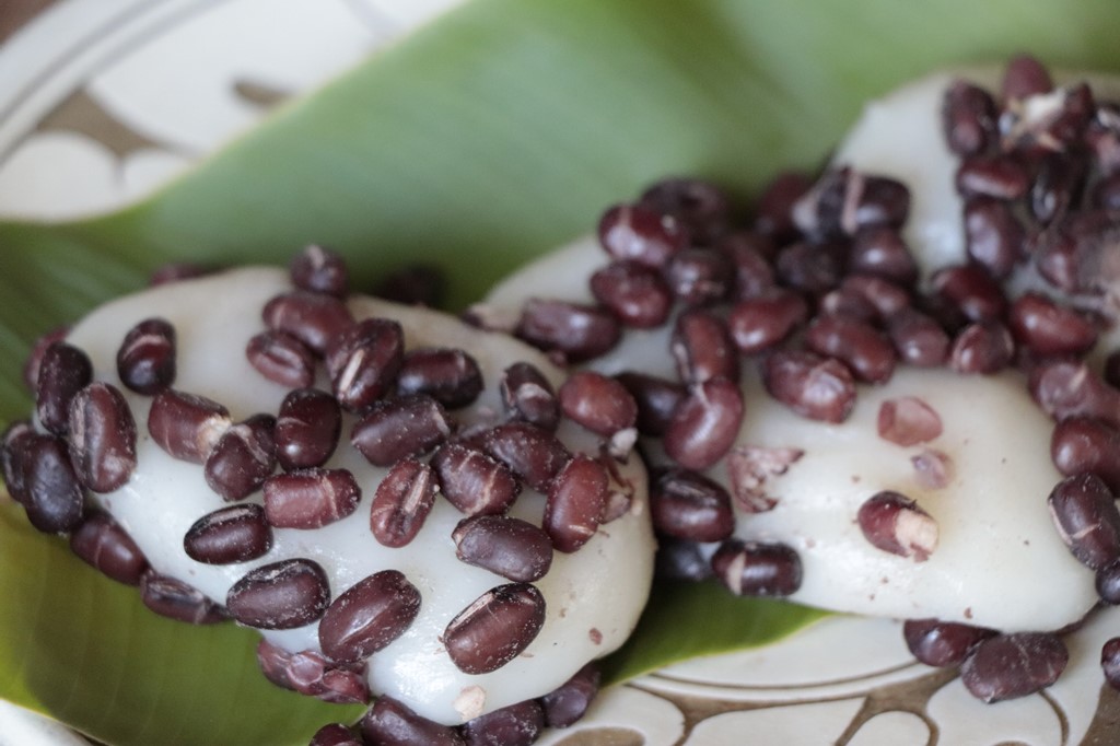 もち粉を水で練って蒸した餅に、塩ゆでした豆をまぶしたもの。