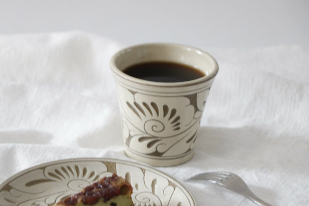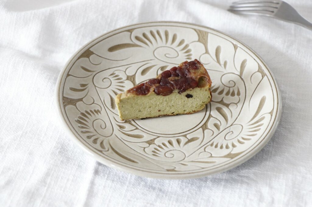 唐草の五寸皿とフリーカップ(小)に、お菓子作り上手のスタッフが、抹茶のチーズケーキとホットコーヒーを運んできてくれました。
